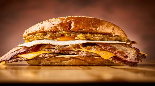 Base de salsa tártara. Doble burger smash de 90 g. con doble de queso cheddar, Baicon crujiente, huevo frito, cebolla caramelizada + Relish de pepinillo. +patatas fritas caseras.