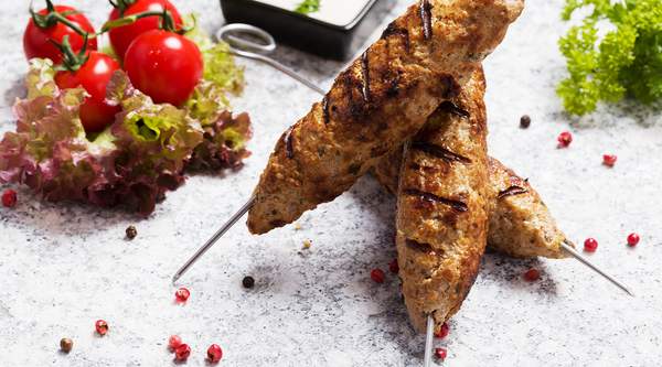 Pinchito de pollo con ajo y limón, con patatas o arroz basmati, ensalada y salsa
