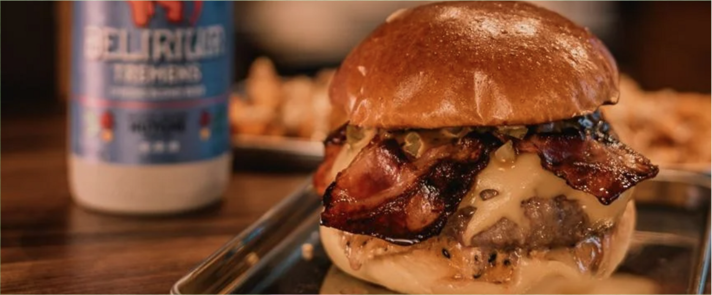 Hamburguesa de pan de patata, salsa especial, doble bacon, edam, cheddar, cebolla plancha y doble Patty (90 g.) de Dry Age de 45 días