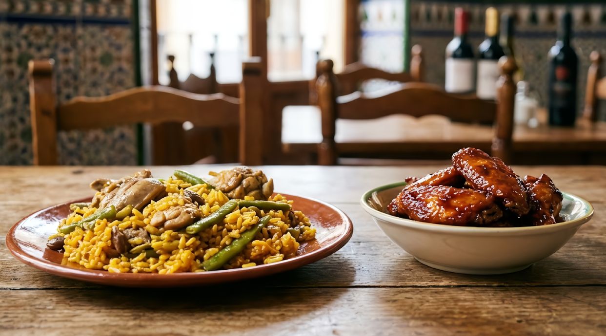 Arroz seco cocinado con azafrán, pollo, conejo y verduras.