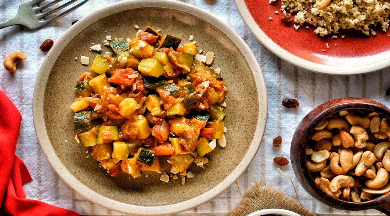 Receta marroquí vegana de verduras especiadas con ras el hanout y acompañadas de un sabrosos cuscús. topping de pasas, cacahuetes y orejones