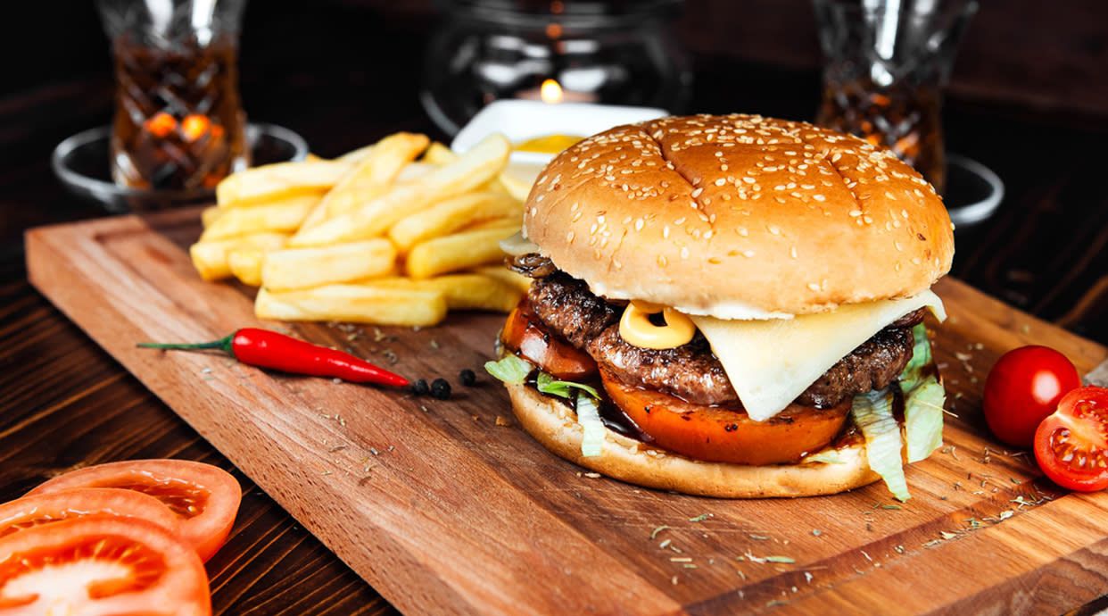 Angus certificado (200 gr.), queso cheddar, bacón, cebolla caramelizada, escarola, tomate, guacamole