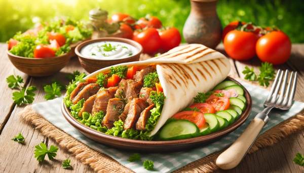 Pan, cordero, pollo, lechuga, tomate, cebolla y salsa