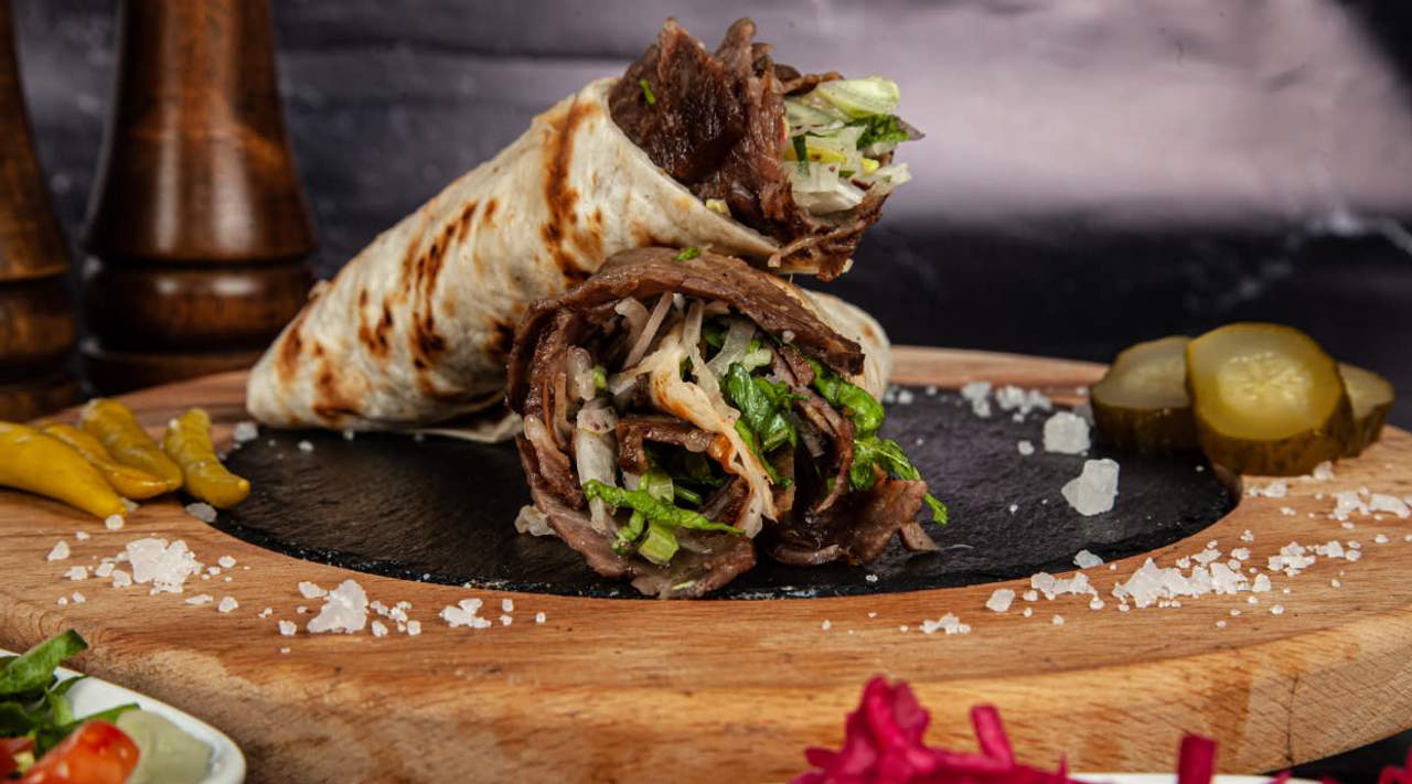 Carne de ternera o pollo, salsa de yogur, salsa picante y pan