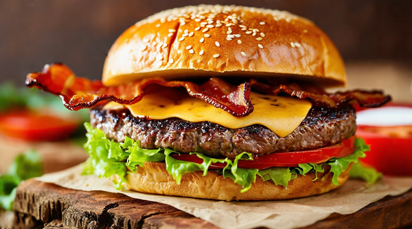Lechuga, tomate carne de (180 g.), queso fundido bacón crujiente, mermelada de pepinillos y nuestra salsa burguer