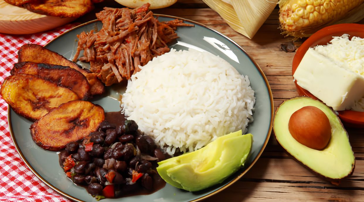 Arroz blanco, carne mechada, alubias negras y tajadas de maduro frito