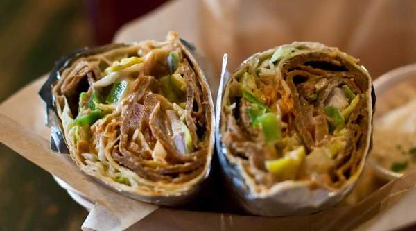 Pan pita, carne, lechuga, tomate, cebolla, zanahoria, maíz y salsas