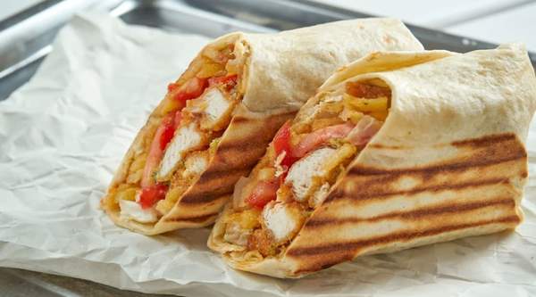Carne de pollo o ternera, salsa, verduras y pan turco