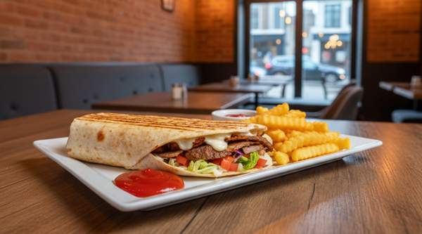 Patatas fritas, carne kebab, queso cheddar y salsa a elegir