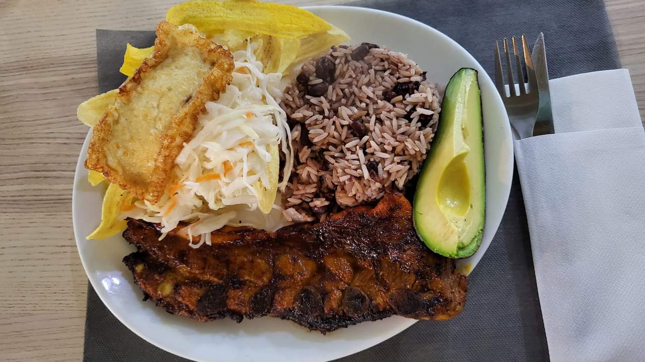 Con gallopinto tajadas de plátano macho, aguacate queso y ensalada de repollo
