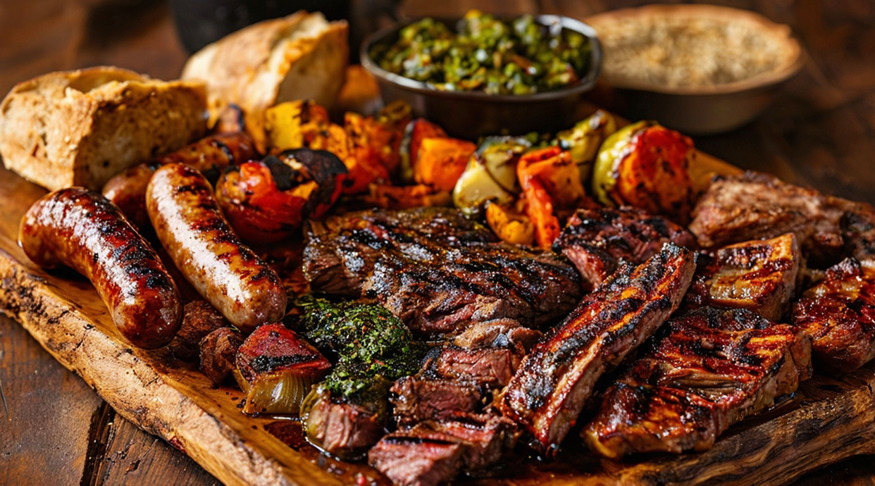 Morcilla (1 ud.), chorizo (1 ud.), longaniza (1 ud.), anticuchos (3 uds.), costillar de cerdo sobre salsa BBQ (1 ud.), chuletas (2 uds.), churrasco (1 ud.), pollo a la brasa entero (1 ud.) y entrecot (1 ud.)