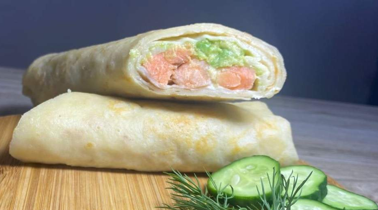 An airy, dietary pancake with soft cream cheese, lightly salted salmon, and buttery avocado