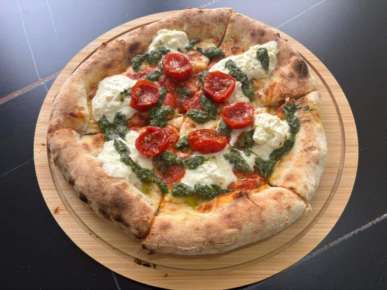 სტრაჩატელა, პესტო, რუკოლა, ჩერი პომიდორი, ბალზამიკო