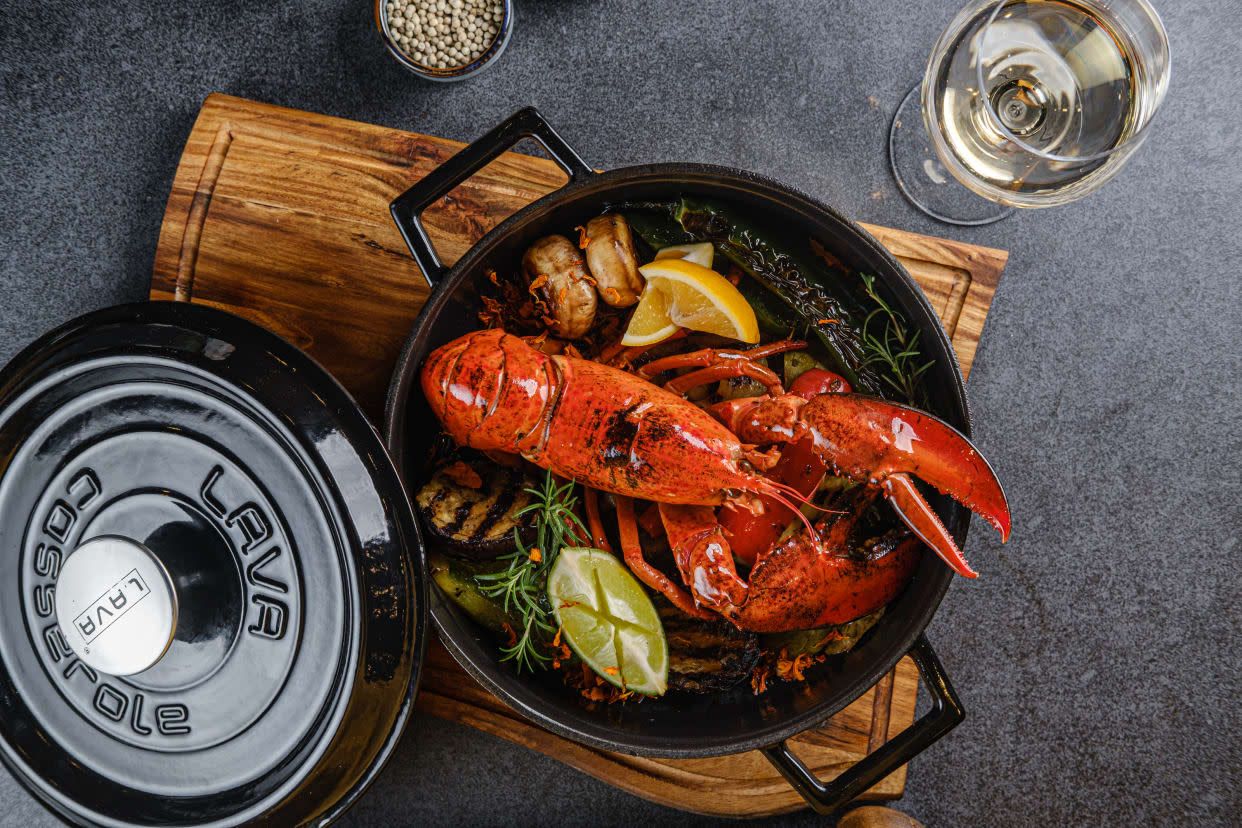 კრევეტები გამოყვანილი ნაღებში, ღვინის სოუსით და ქართული სუნელებით