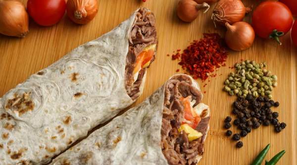 ღორის ხორცი, მაიონეზი, კეტჩუპი, წიწაკა, ხახვი, სალათის ფოთოლი, პომიდორი, ლავაში