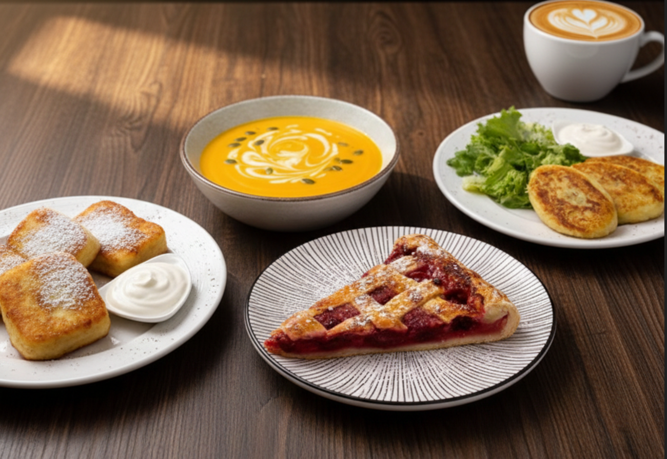 ბლინები ხაჭოთი: თხელი ნაზი ბლინი ტკბილი ხაჭოთი და ვანილით; სმეტანასთან და შაქრის პუდრით.