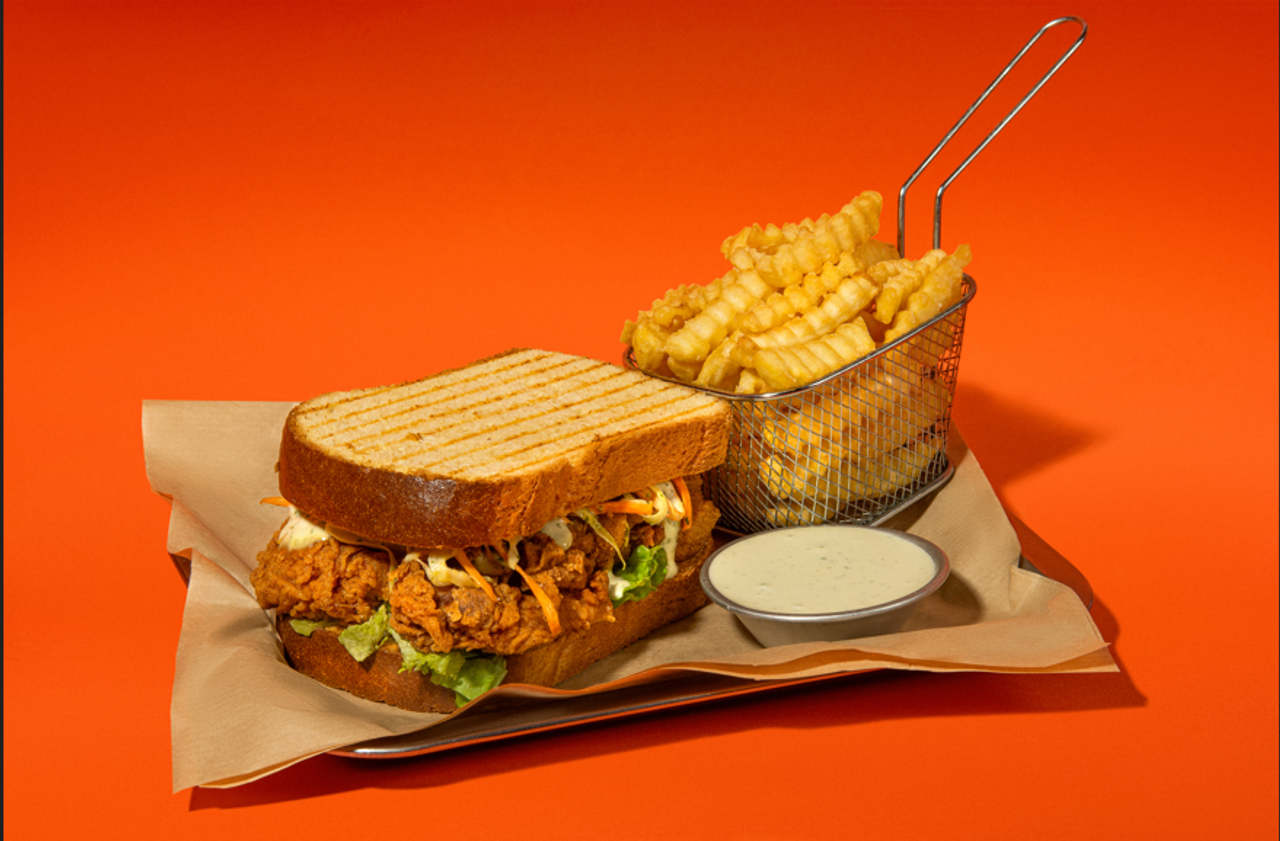 ბრიოშის ტოსტი,ტკბილი მდოგვის სოუსი, ქოუსლოუ, აისბერგი, ხრაშუნა ქათამი