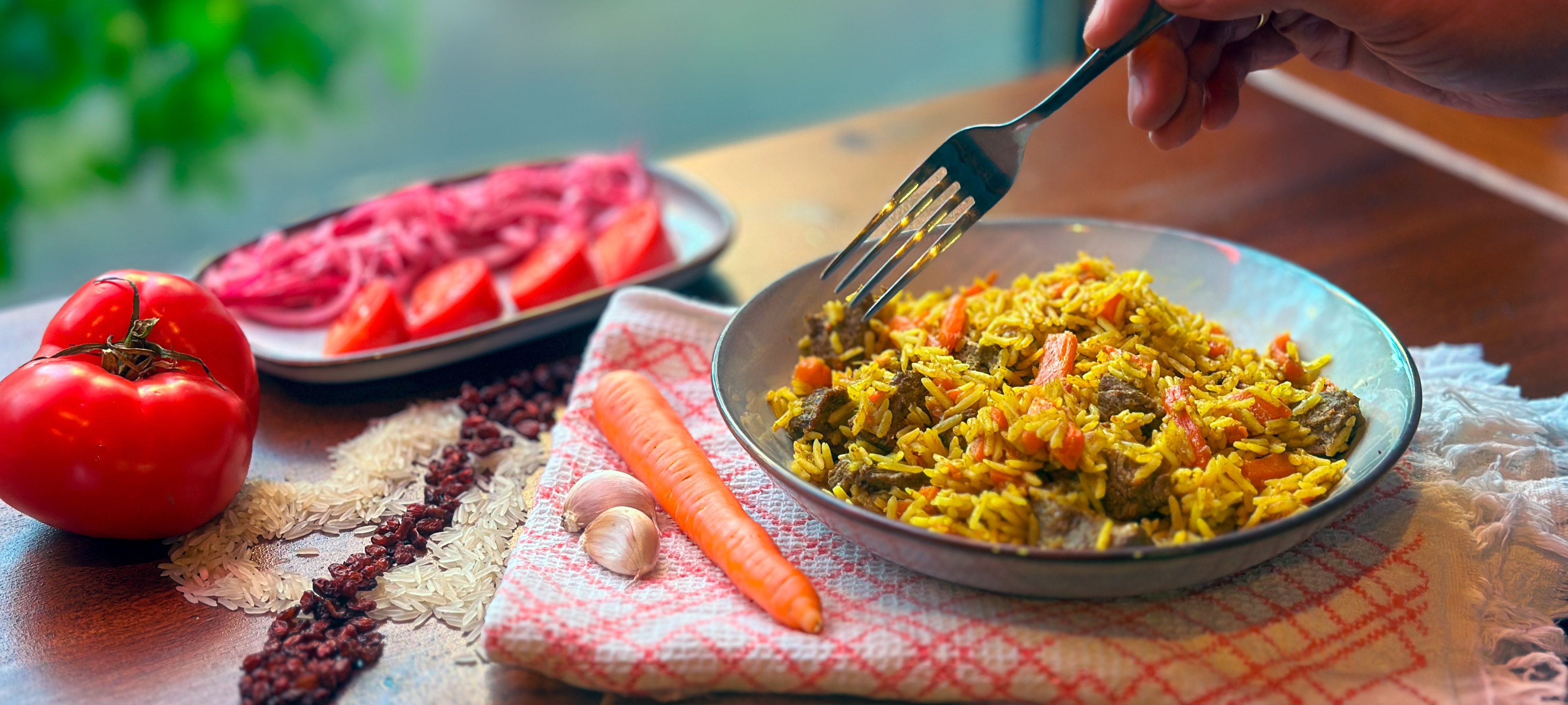 Taste our hearty 250g Plov with fresh tomatoes and pickled onions. Made with basmati rice, chickpeas, mushrooms, carrots, onions, and spices. Perfect for Lent. A plant-based delight!