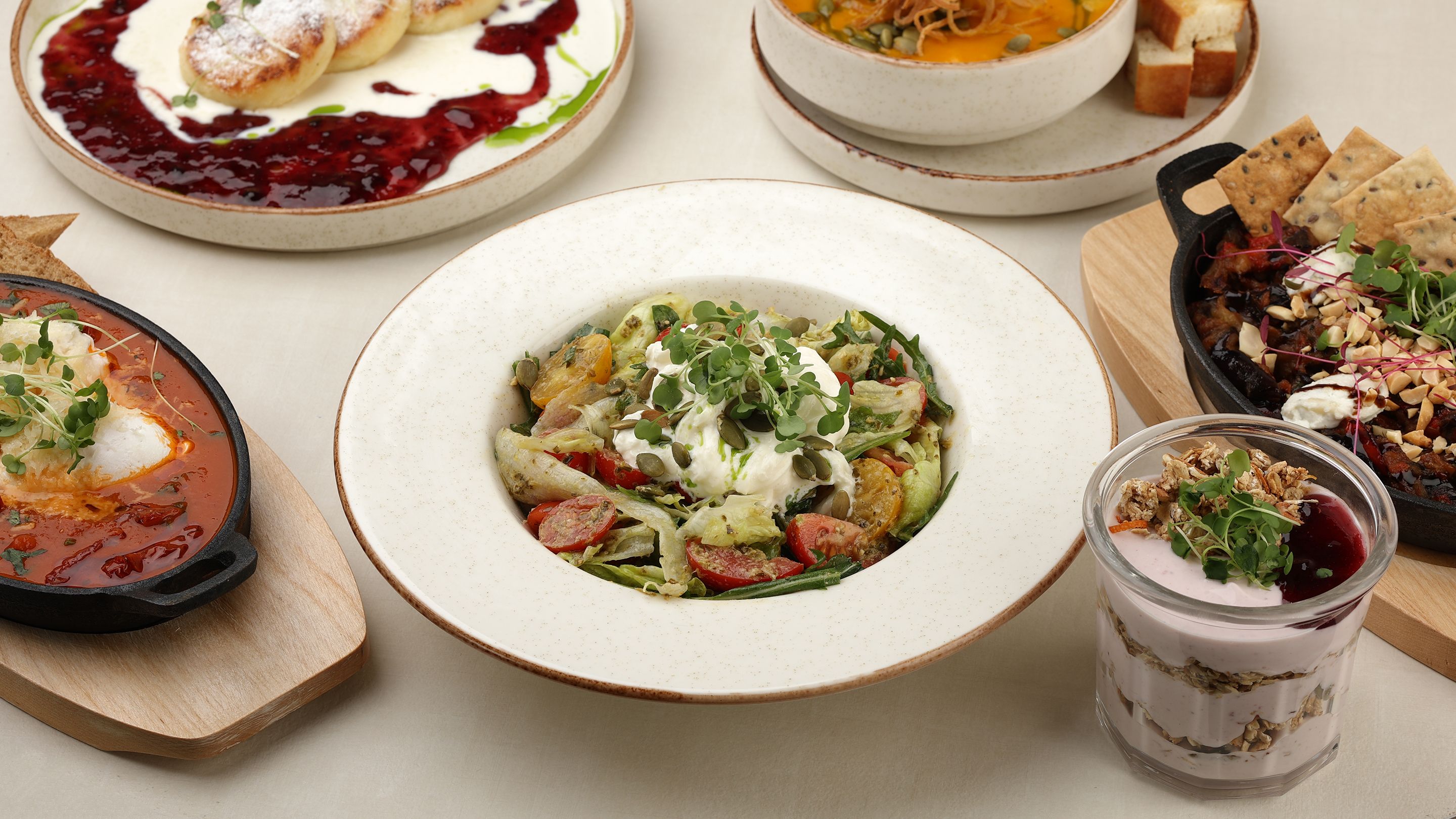 გაწურული მაწონი,არაჟანი,კენკრის ჯემი,გრანოლა,დარიჩინი