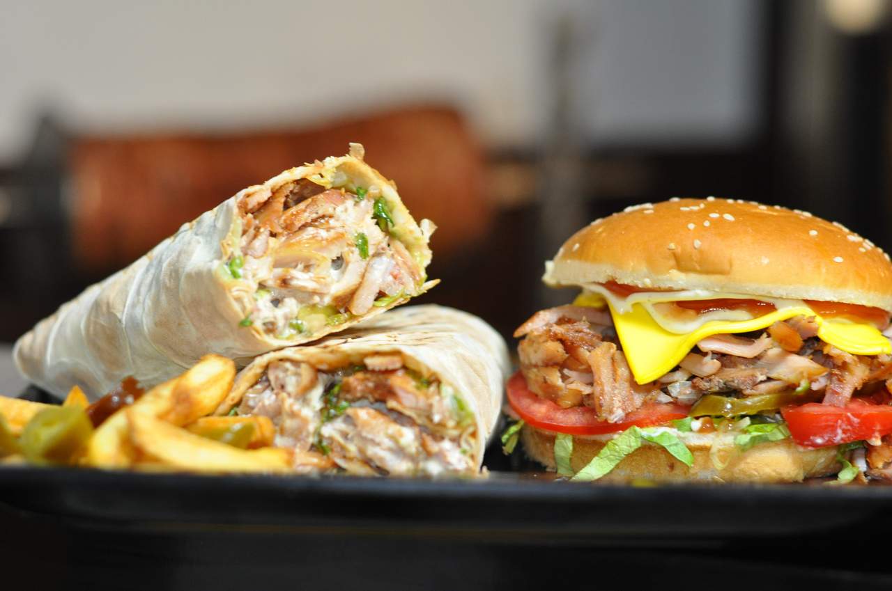 ხორცი,ლავაში, სალათის ფოთოლი,წითელი კომბოსტო,სტაფილო,კიტრი,პომიდორი,ხახვი, წიწაკის მწნილი, კეჩუპი, მაიონეზი.ჯანსაღი და ნოყიერი საკვები