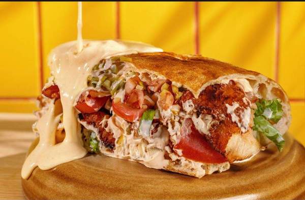 ხრაშუნა ქათამი, ტკბილი-მდოგვის სოუსი, სალათის ფოთოლი, პომიდორი, პიკული, მდნარი ყველის ყველის სოუსი