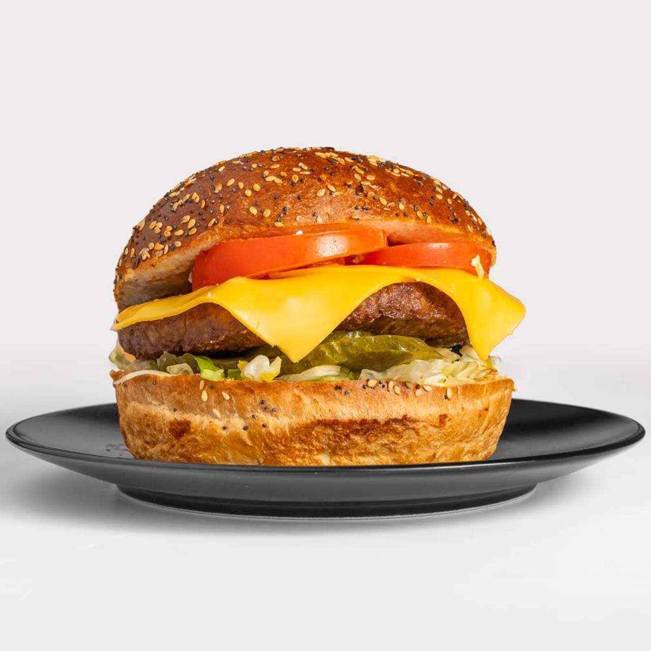 Burger pljeskavica od izolata proteina graška, brioche burger pecivo, iceberg salata, rajčica, kukuruz, majoneza, ketchup