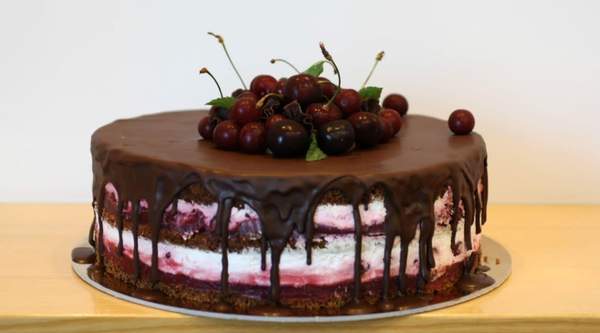 1 komad. Sastojci: crna čokolada, jaja, šećer, želatina, maslac, na podlozi od kakaovog biskvita