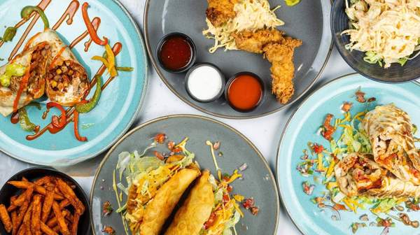 Tortilja punjena piletinom,paprikom,lukom,kukuruzom,grahom,salsa umakom,čili mljevenom paprikom sa bijelim umakom sastrane