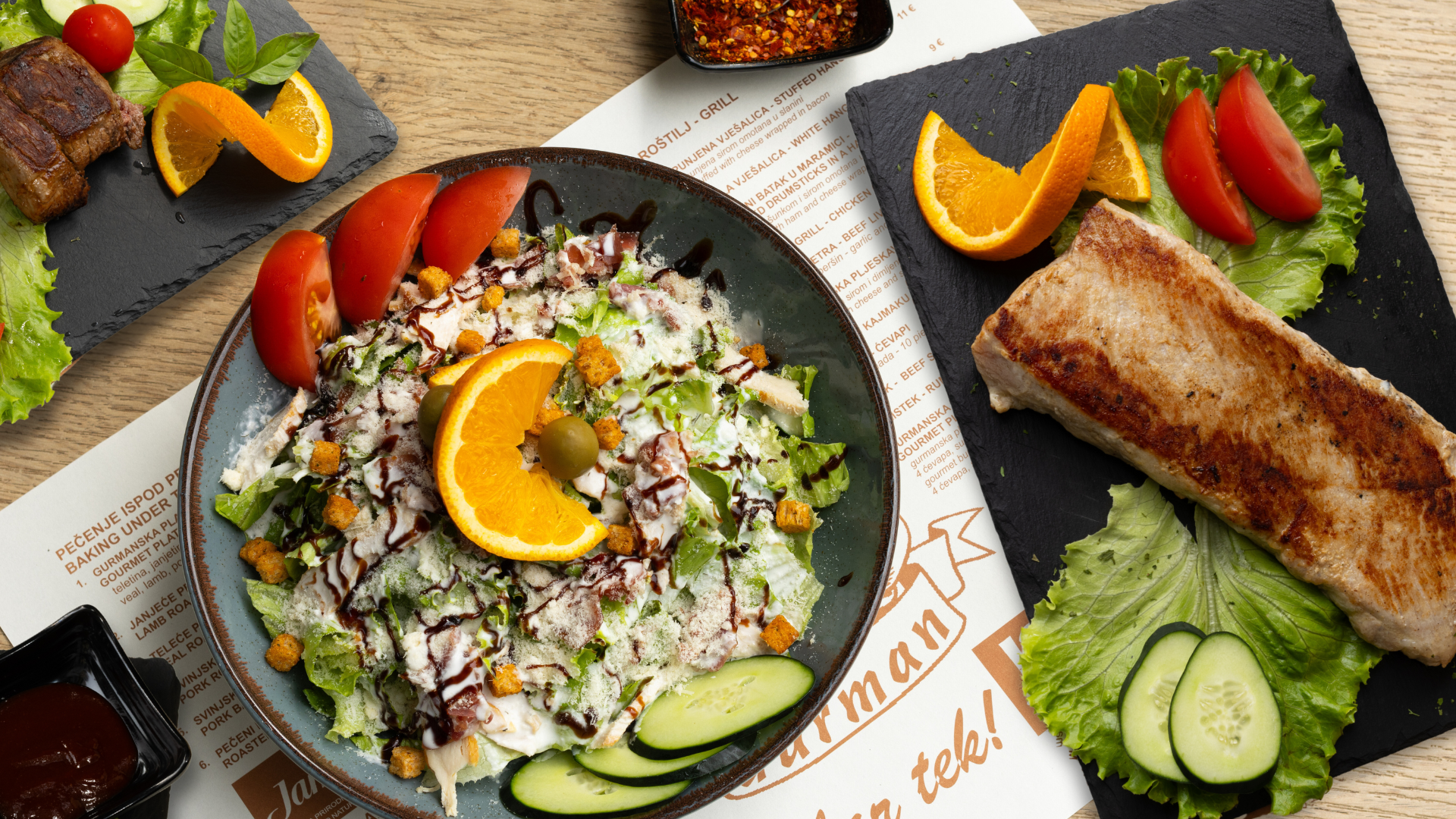 Zelena salata, krastavac, rajčica, kubeti, piletina, panceta, parmezan, cezar sos
