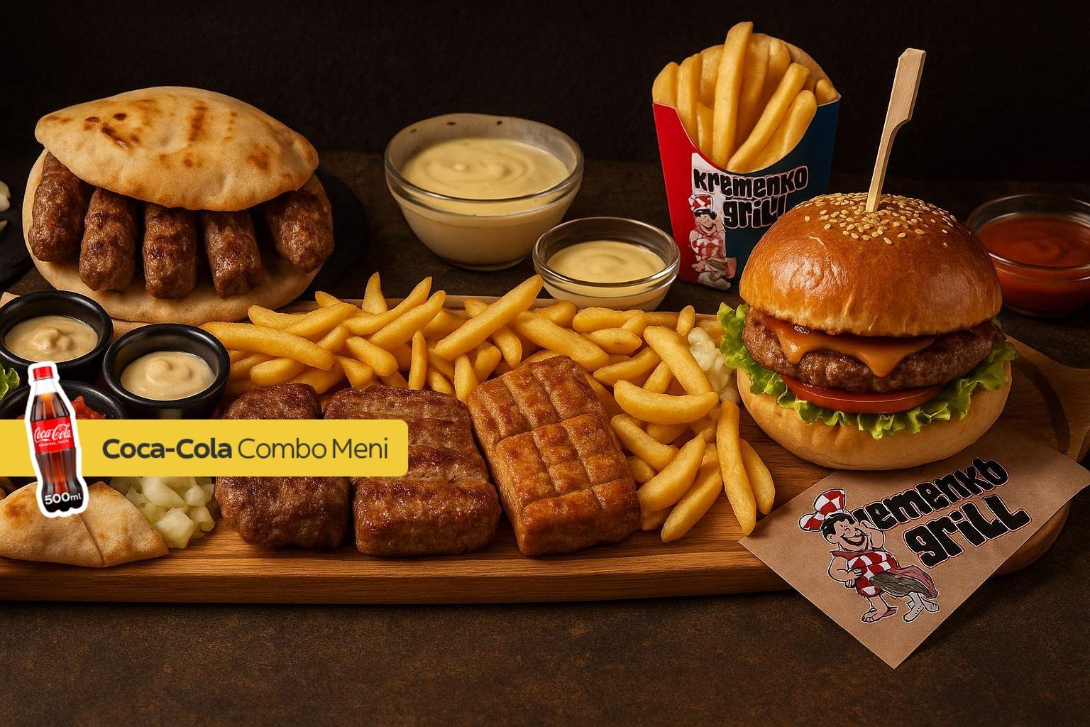 1x punjeni pileći batak, 1x punjena vješalica, 1x gurmanska pljeskavica, 1x ćevapi (10 komada), 2x pommes frites, 1x krumpirići pole, 2x kajmak
