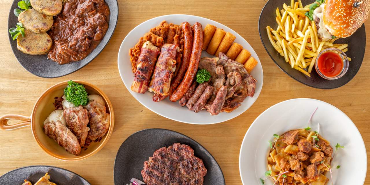 Medaljoni od svinjskog filea, pljeskavice, punjena pileća rolica, zapečeni grah, krumpir police *Slika je simbolična