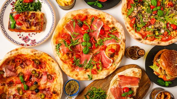 Umak od rajčice, mozzarella fior di latte, premium šunka, zlatni šampinjoni, ekstra djevičansko maslinovo ulje, svježi bosiljak, masline