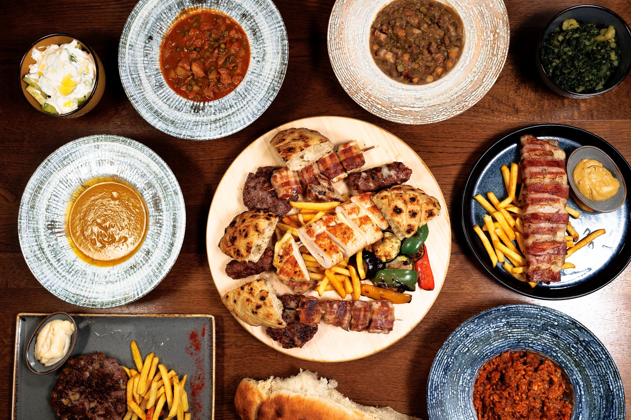 8 ćevapa, 4 gurmanska uštipka, gurmanska pljeskavica, 2 pileća ražnjića, 2 svinjska ražnjića, 2 punjene vješalice, krumpirići, luk, ajvar *Slika je simbolična.