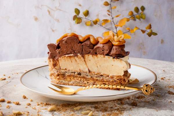 Delikatni čokoladni biskvit obogaćen kesten pireom, nugat mousseom i karamelom, prekriven ganaš glazurom. Iz naše jesenske kolekcije!