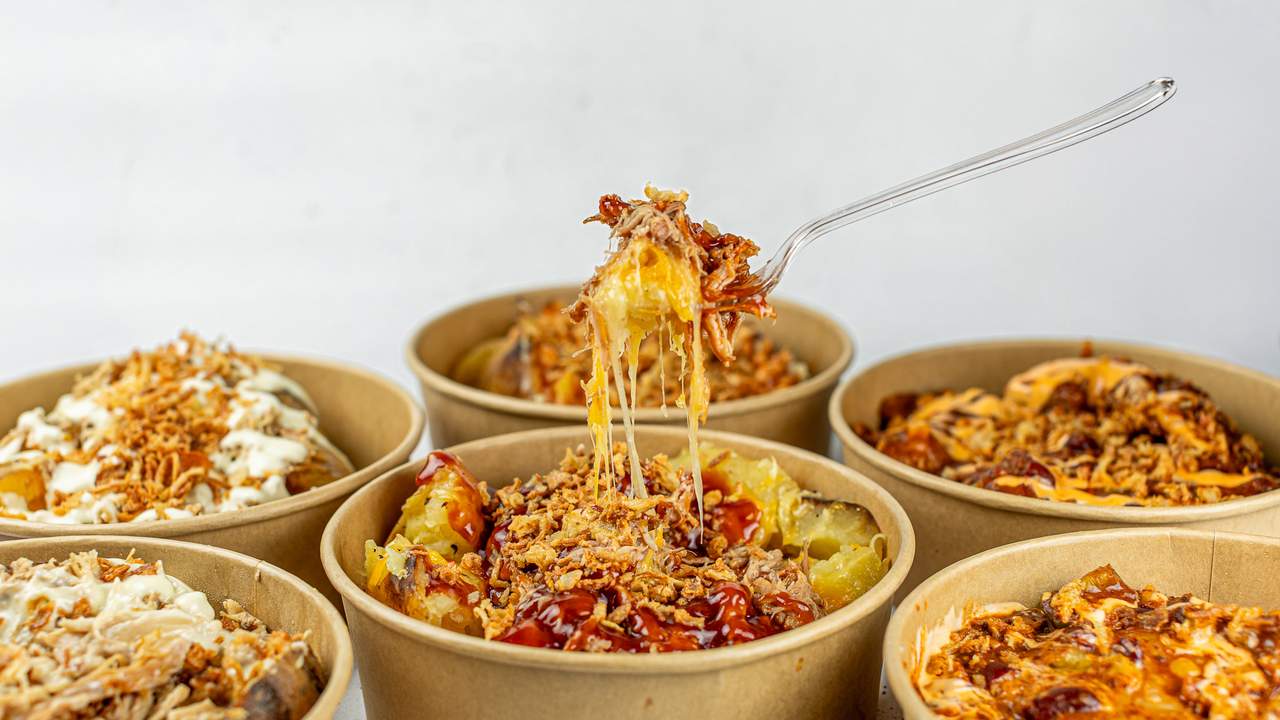 Krumpir, mix cheddar sireva, miješano mljeveno meso, kukuruz, grah, chilli majoneza, prženi luk