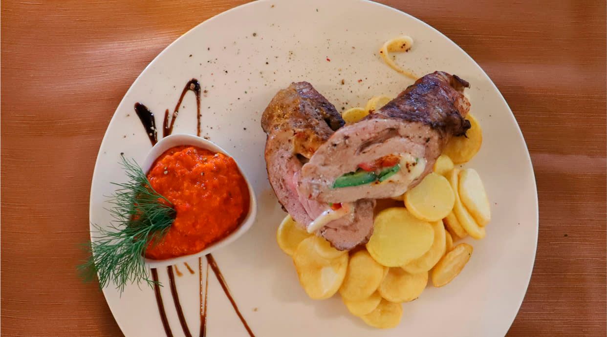 Svinjski kare punjen sa sirom, špekom i kiselim krastavcima, omotan u svinjsku maramicu
