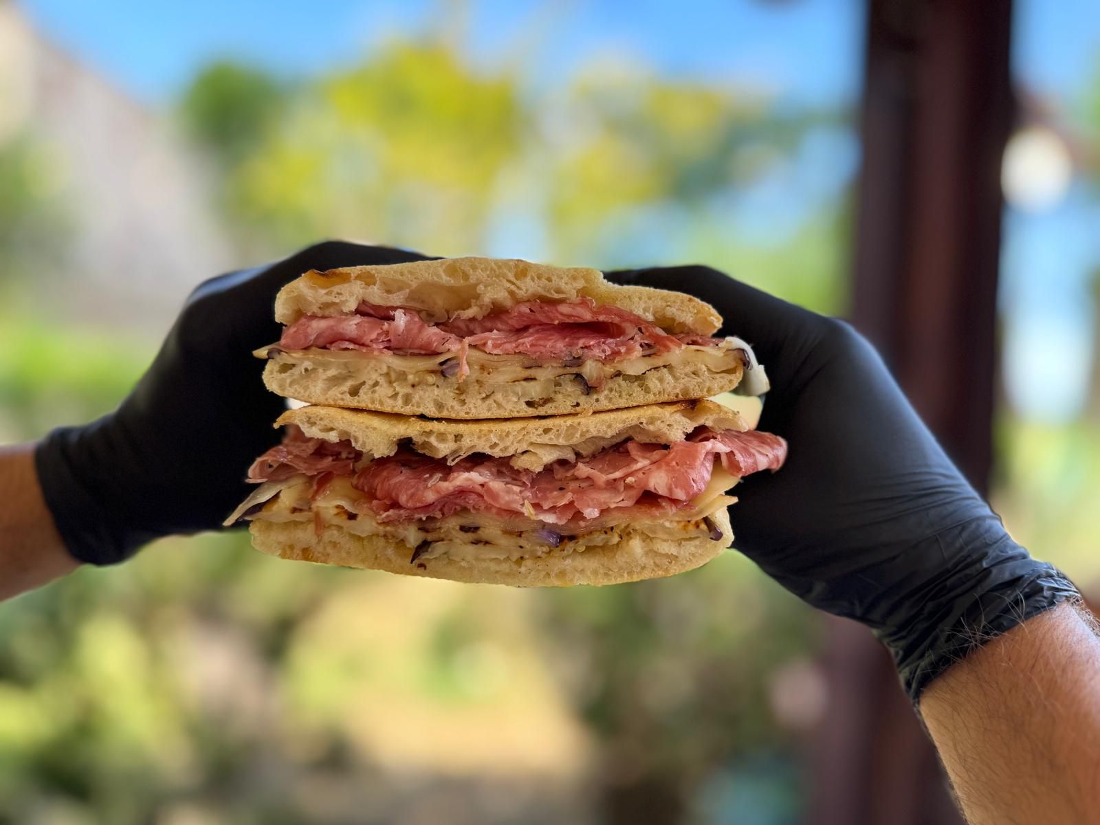 Una fragrante focaccia artigianale farcita con salame finocchiona toscano, dall’aroma intenso e speziato, impreziosita da melanzane grigliate per un tocco di dolcezza e morbidezza, e scamorza filante che aggiunge cremosità e gusto.