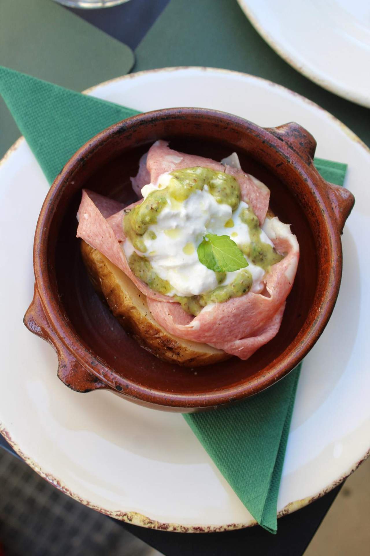 Patata alla cenere con stracciatella, pesto pistacchio e mortadella