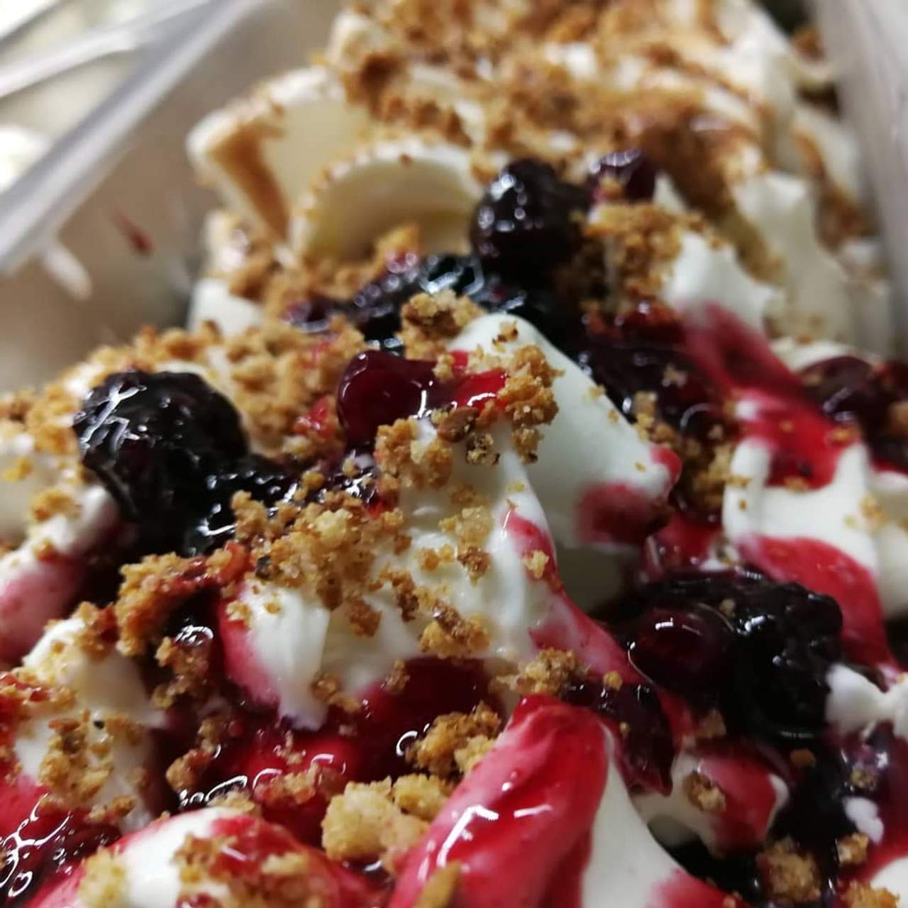 Banana, gelato fior di latte, gelato crema, gelato cioccolato, panna montata, scaglie di cioccolato