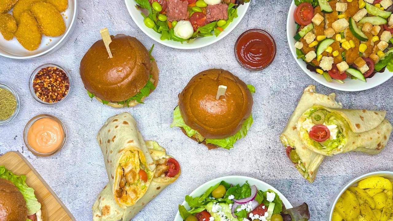 Wrap con misticanza, burger vegetale a fette, crema di cheddar, avocado e salsa burger
