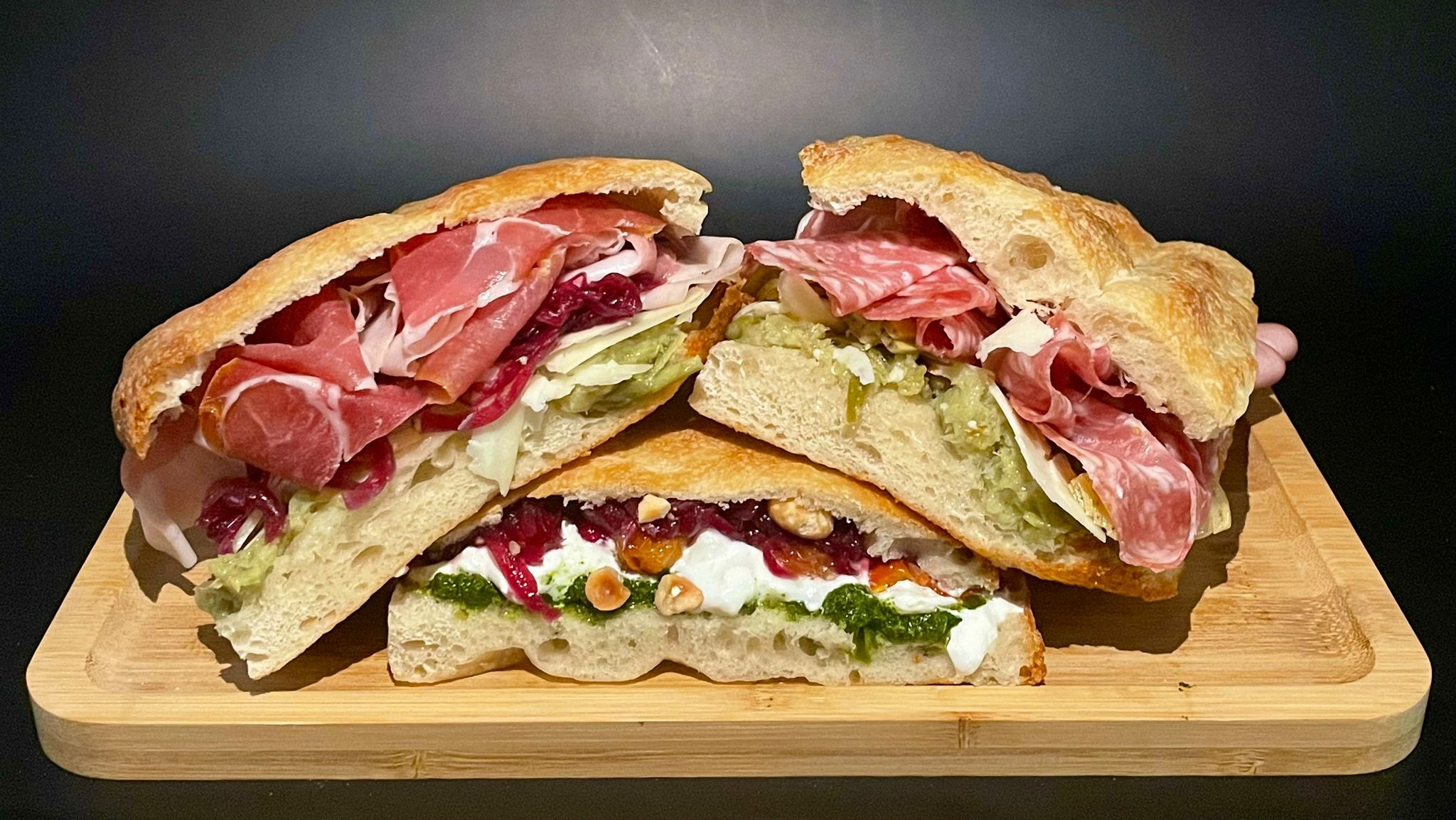 Piadina romagnola artigianale fatta mano, 100 grammi di prosciutto crudo di Parma DOP, cavolo cappuccio viola al gin, stracciatella Pugliese DOP e noci
