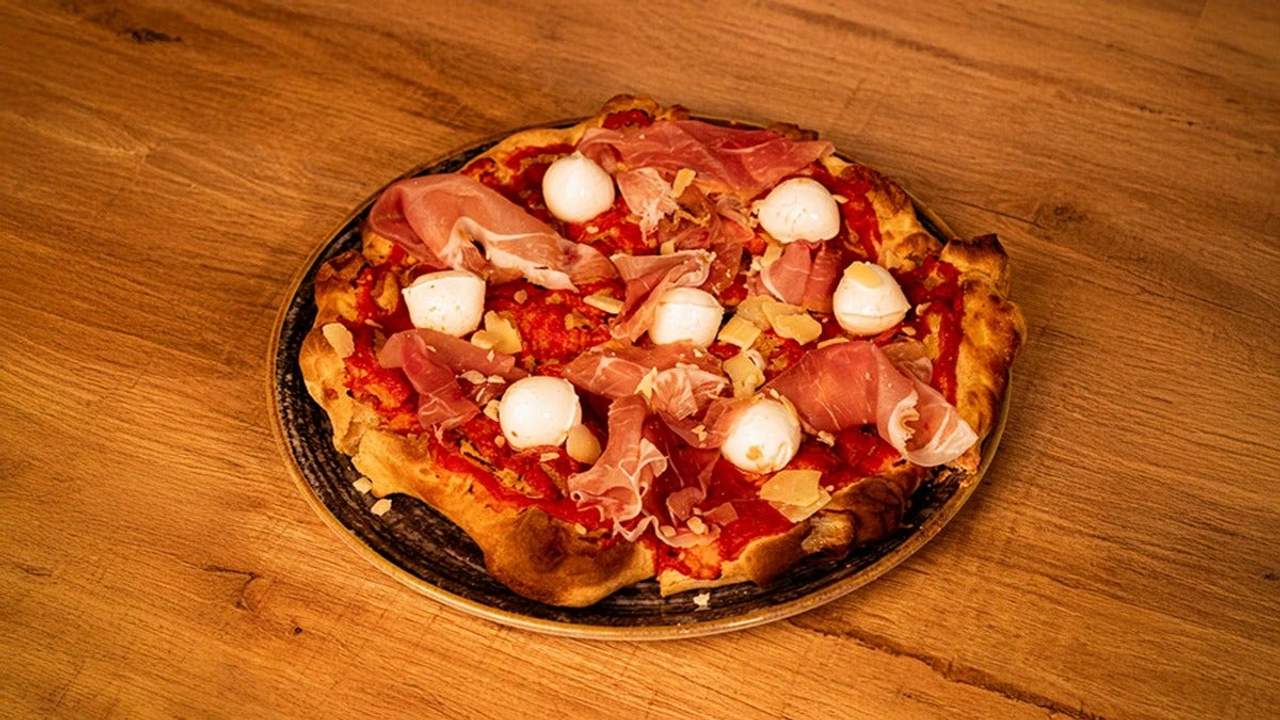 Pomodoro e fuori forno: crudo di Parma 24 mesi, bufala campana D.O.P, scaglie di grana e olio E.V.O. (Glutine, latte e derivati)