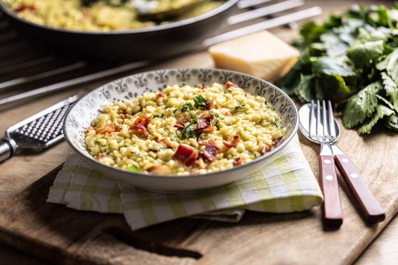Rosti di Patate Servito con Salmone Affumicato e Riso Basmati, olio EVO