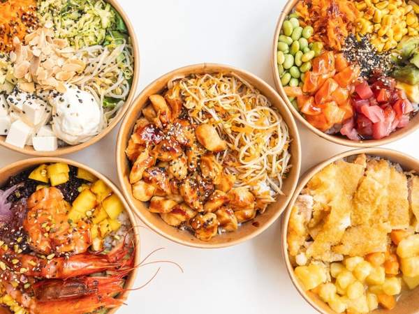 Riso bianco sushi, riso nero integrale, mango, avocado, mais, cipolle cotte asian inn, gambero rosso -salmone – salsa teriyaki -Soia wasabi limone -granella pistacchio e sesamo