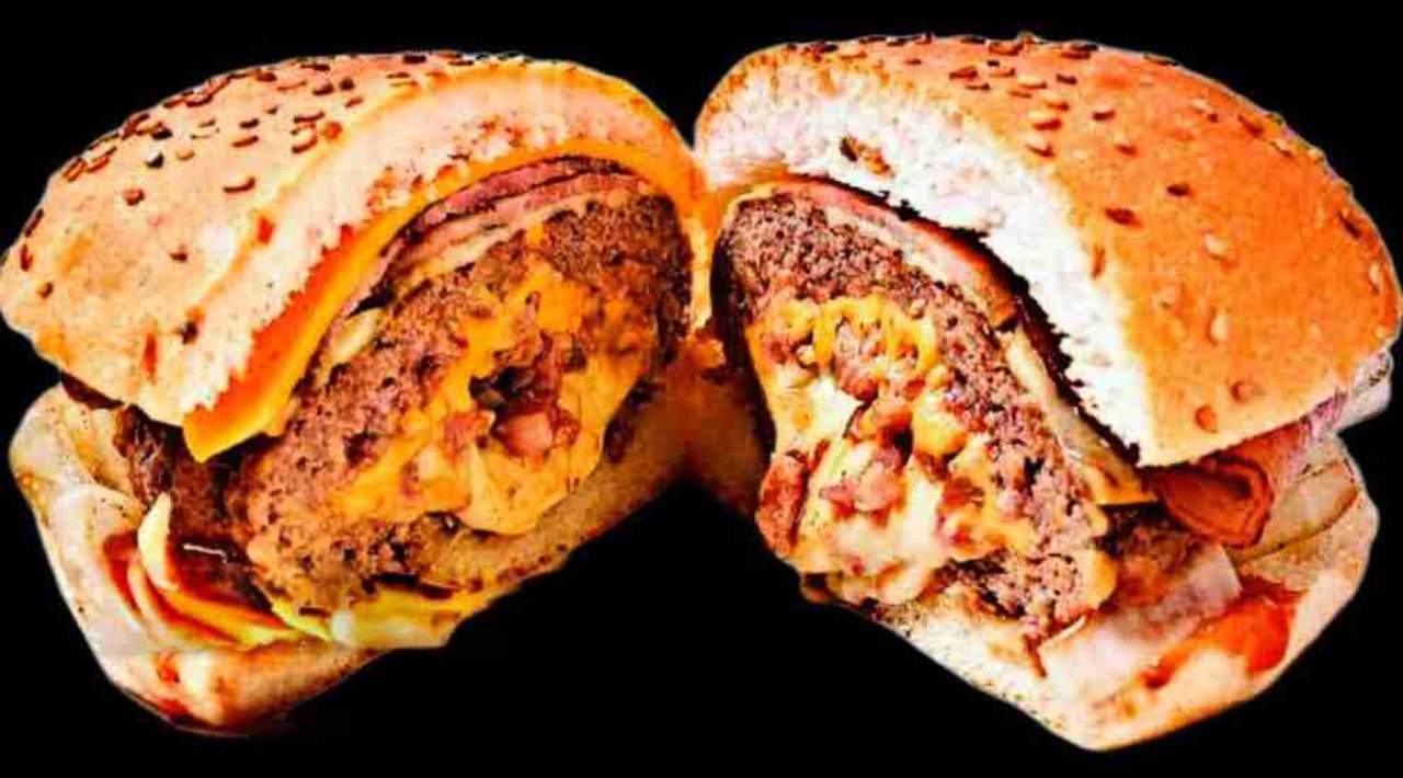 Hamburger da 220gr(ripieno di burro d’arachidi) pancetta, cheddar cheese, lattuga, pomodoro, quadruplo bacon e salsa golden home made