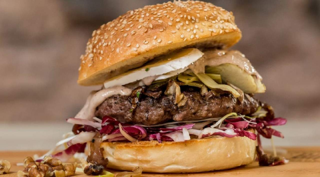 Hamburger di erbe di campo, radicchio stufato, pomodoro ciliegino confit, formaggio di capra e maionese al basilico.