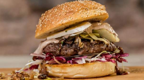 Hamburger (cuore di reale), cheddar, bacon croccante, insalata verde, pomodoro a fette, cipolle caramellate, salsa rosa BIF