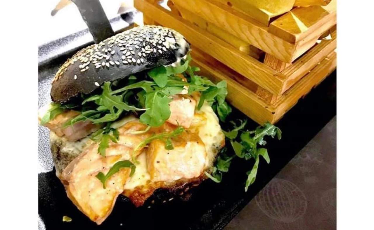 Manzo francese, bacon croccante, cipolla caramellata,uovo , salsa BBQ, formaggio raclette, patate fritte fresche.