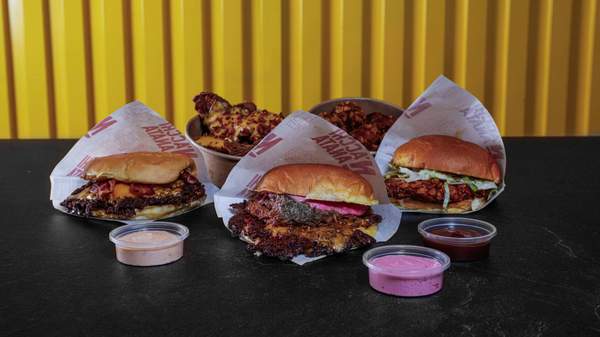 doppio smash burger vegetale, triplo cheddar, salsa bbq, mayonese e cipolla croccante