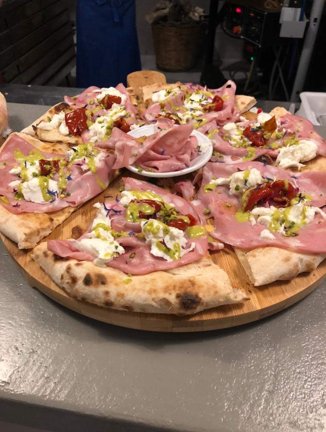 Salsa con pistacchio verde , mozzarella di bufala , mortadella di cinghiale , pistacchi in granella ,fiordalisi misti